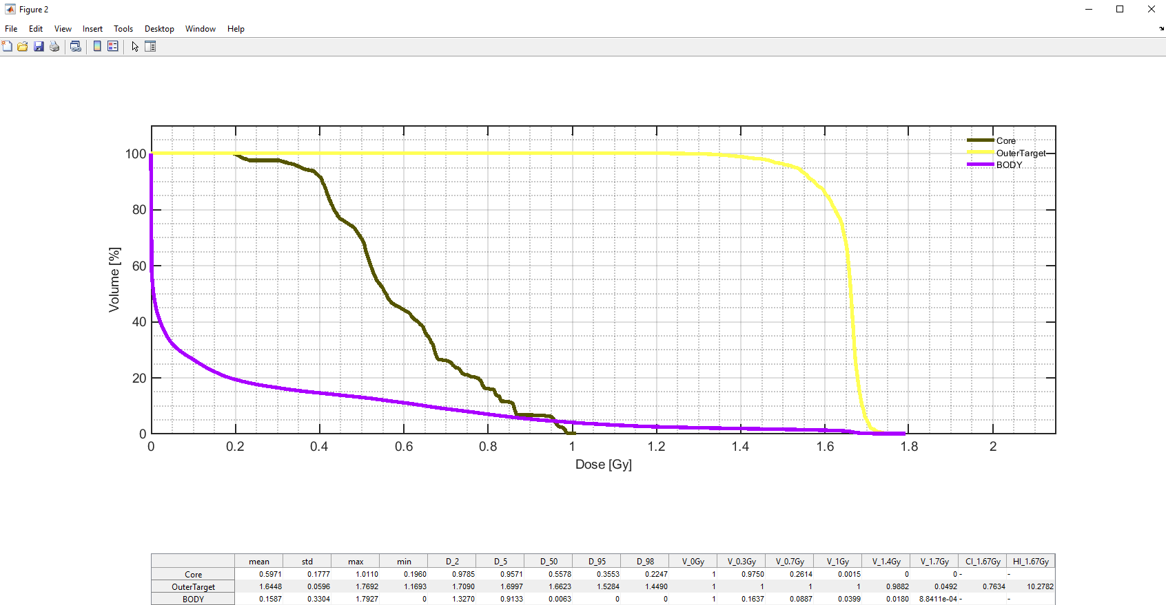 The diagram shows the DVH and in the table, you see the mean, maximum and minimum dose for every VOI. Additionally, the dose and dose-volume coefficient for several confidence levels are displayed.
